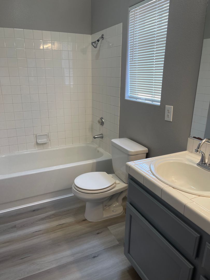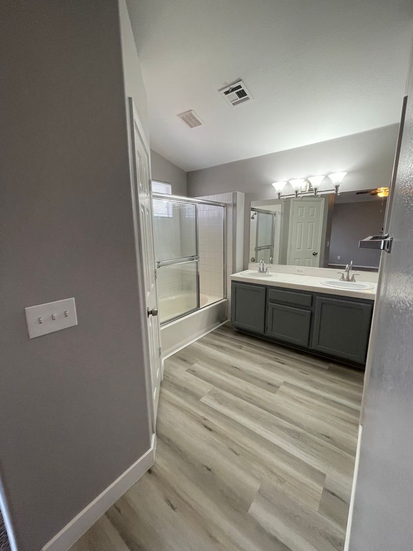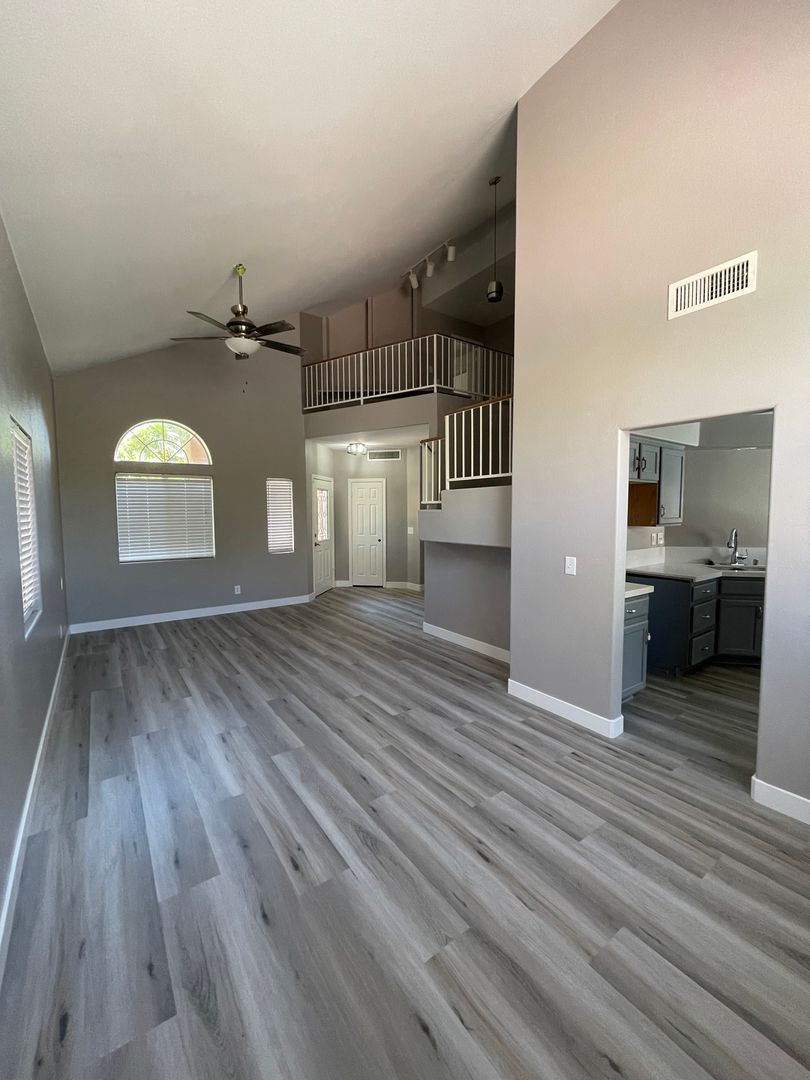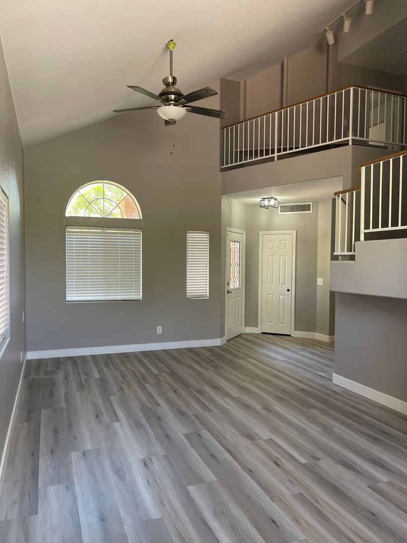 Beautiful 4 Bedroom Pool Home! Two Tone Paint, luxury vinyl plank downstairs & carpet upstairs. Rehabbed kitchen w/new cabinet paint, quartz counters & stainless steel appliances. One Bedroom & Full Bath Downstairs. Open Kitchen with breakfast bar and eat in nook. Family room, Formal living & dining. Loft upstairs with built in desk and 3 bedrooms! Gorgeous yard with replastered sparkling pool just in time for summer. Tenant pays pool service of $130/month & landscape $150/month.